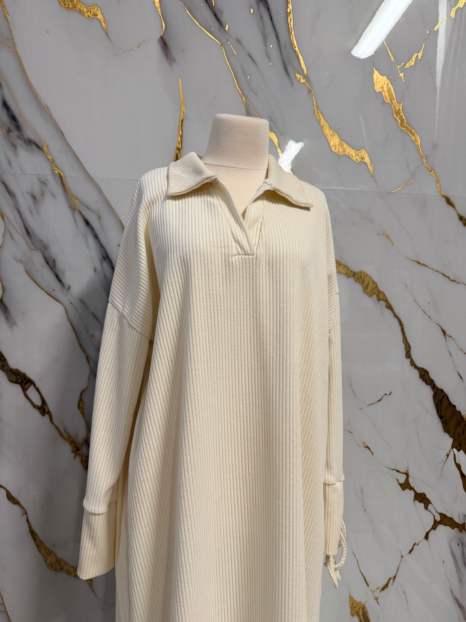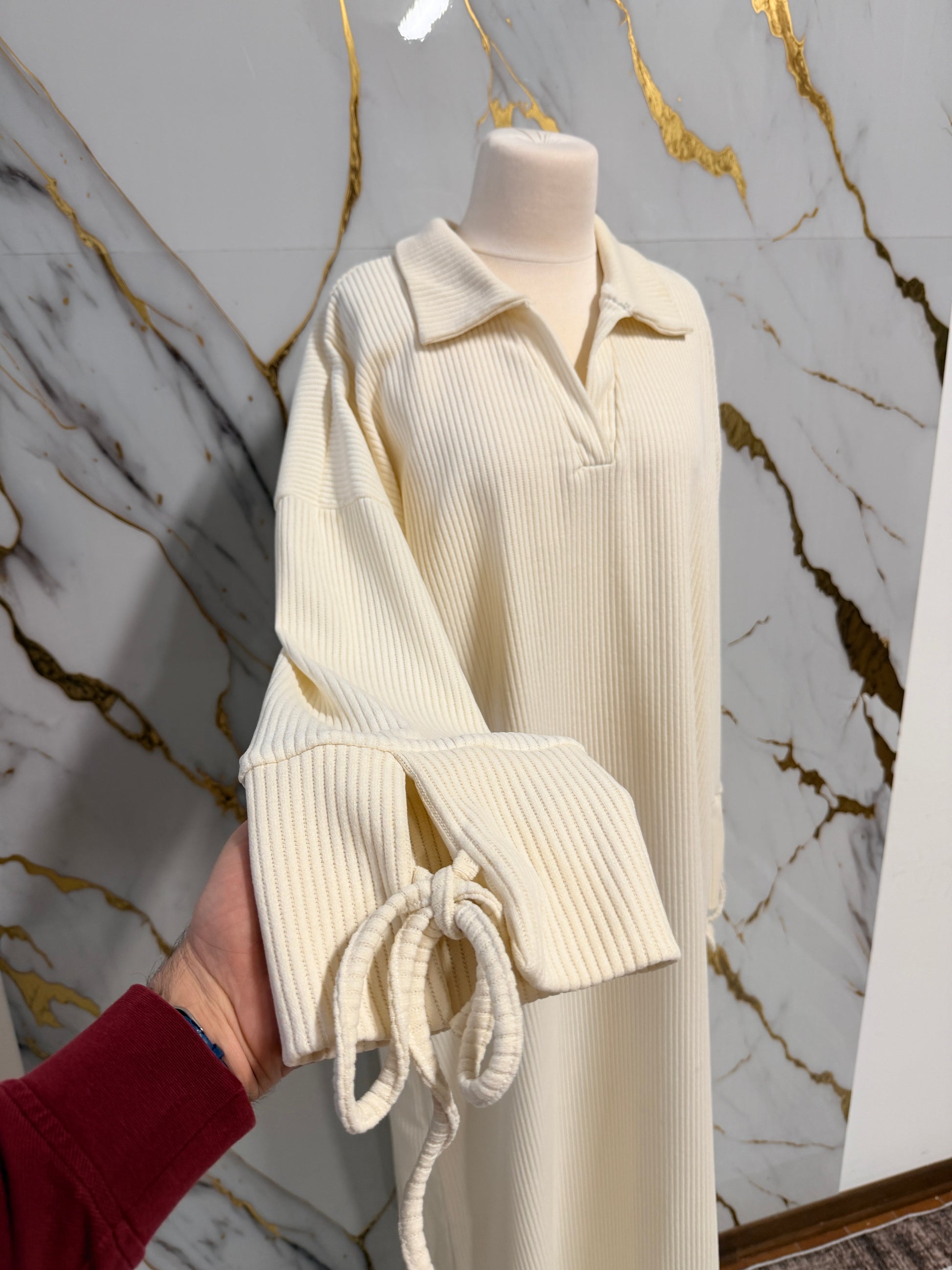 Il design è impreziosito da un collo a risvolto con apertura a V, che dona un tocco moderno e sofisticato. Le maniche ampie sono rifinite con costine delicate e con pratici lacci regolabili ai polsini. La tonalità crema, neutra e versatile, la rende perfetta da abbinare ai tuoi accessori e capi invernali preferiti.