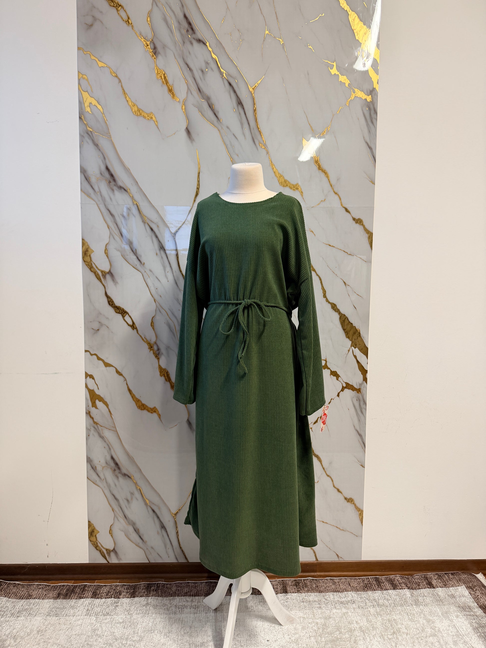 Avvolgiti nel comfort e nell’eleganza con questa abaya invernale dal taglio semplice e raffinato. Realizzata in tessuto a coste morbido e caldo, è perfetta per le giornate fredde. Il colore verde intenso dona un tocco naturale e sofisticato, mentre la cintura in vita regolabile valorizza la silhouette con discrezione. Le maniche lunghe e la vestibilità rilassata garantiscono comfort e libertà di movimento, rendendola ideale per l’uso quotidiano o per occasioni speciali durante la stagione invernale.