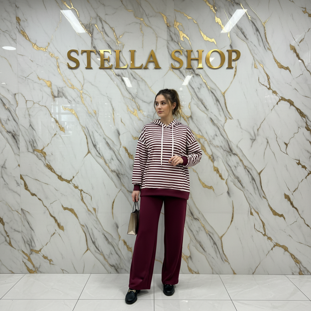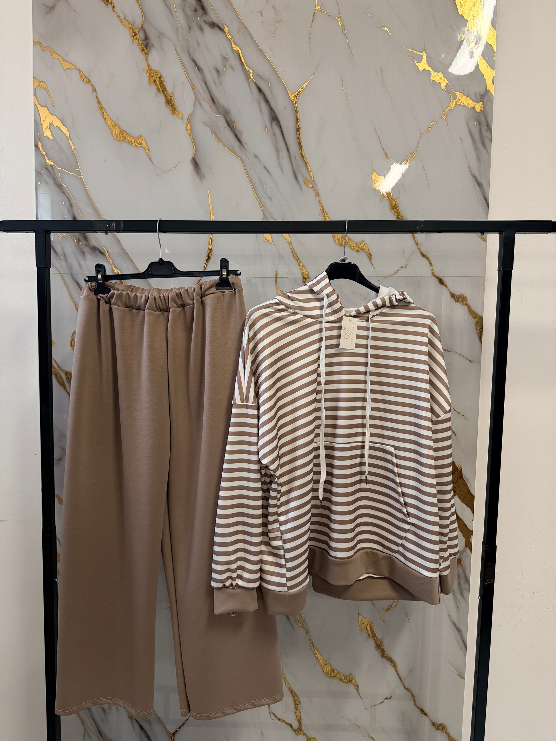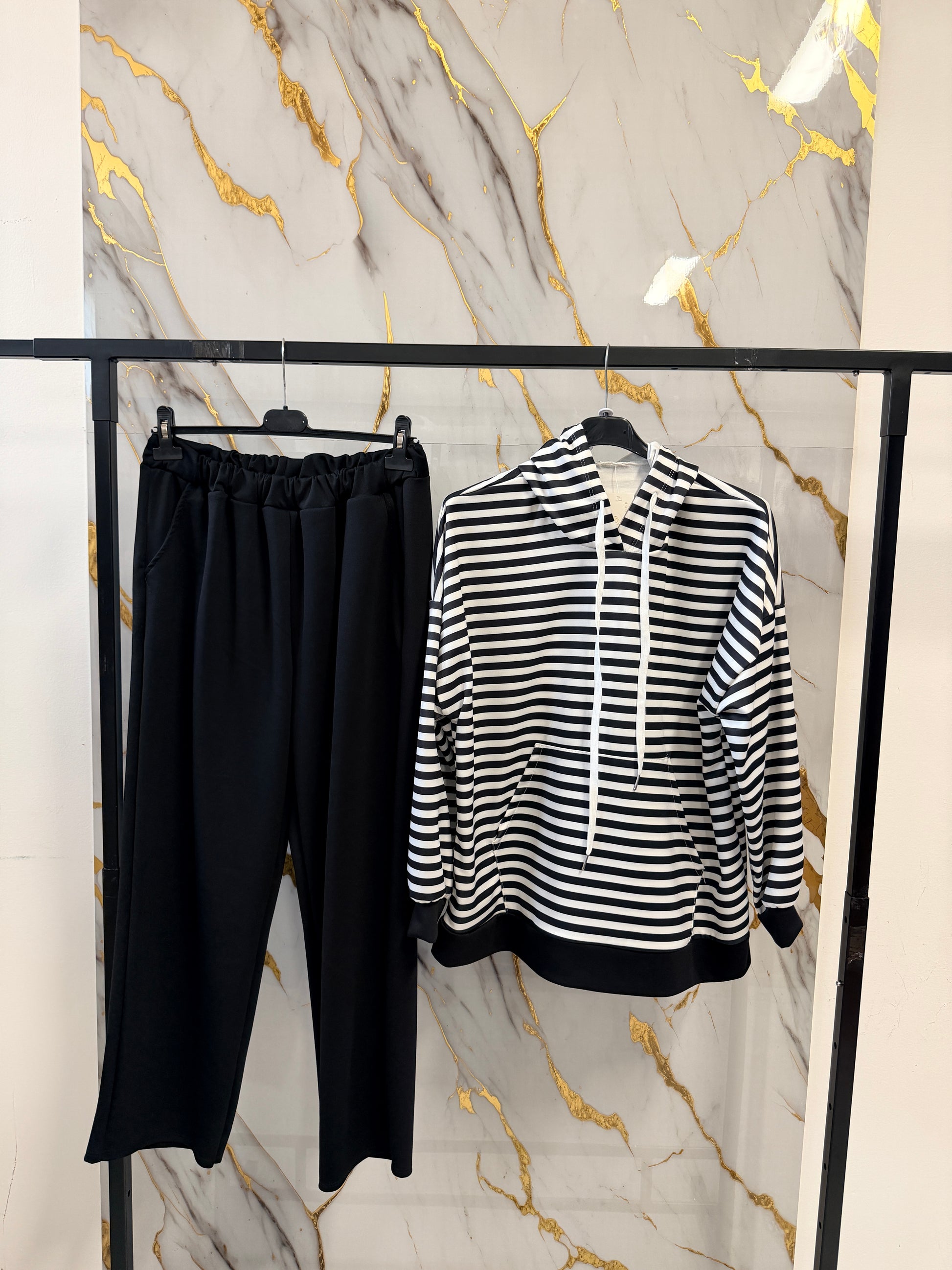 Aggiungi un tocco di stile al tuo guardaroba quotidiano con questo completo elegante e confortevole. La felpa a righe, con cappuccio e coulisse, offre un look moderno e rilassato, perfetto per ogni momento della giornata. Le maniche morbide e la vestibilità leggermente oversize garantiscono massimo comfort senza rinunciare allo stile.