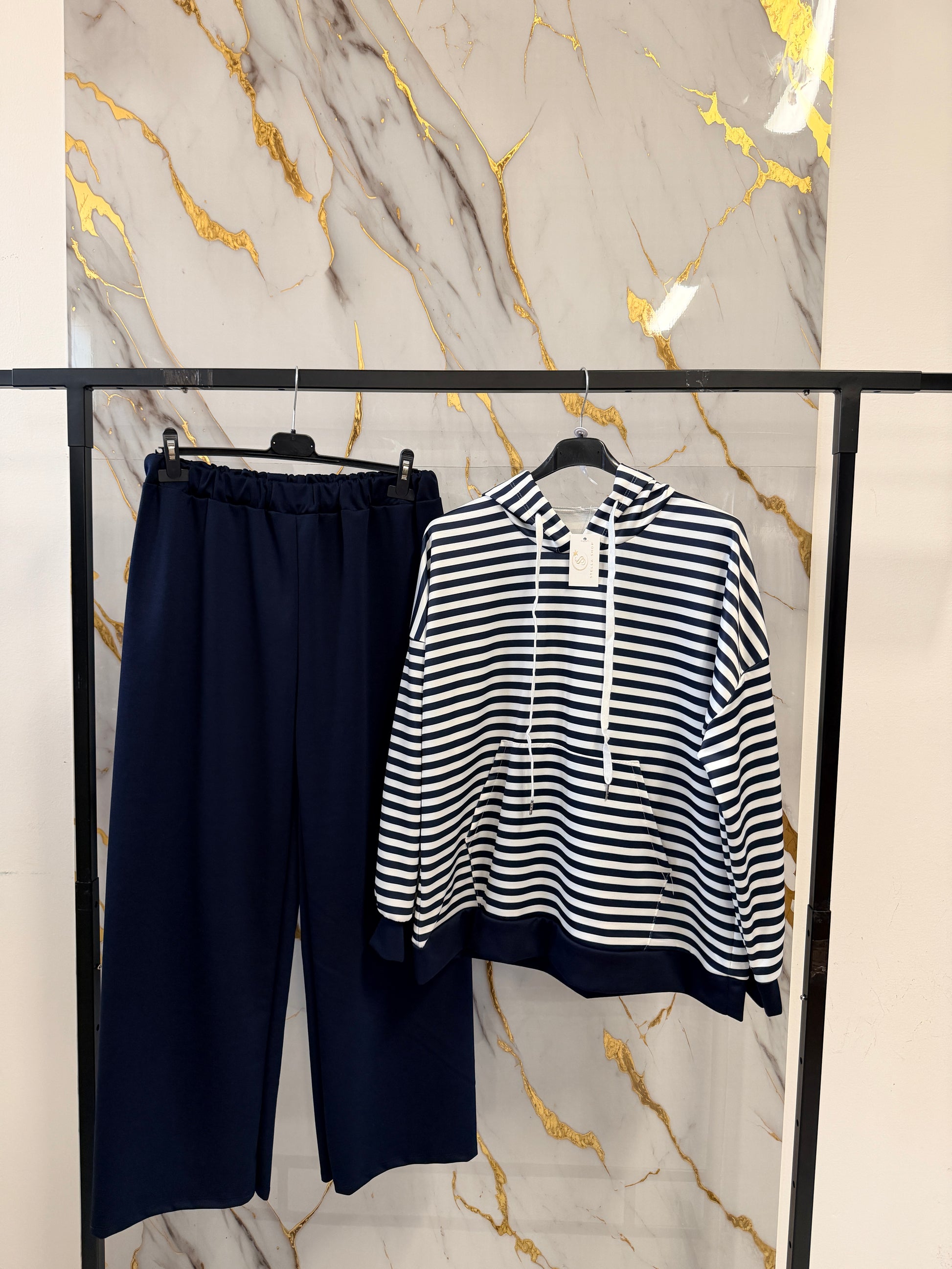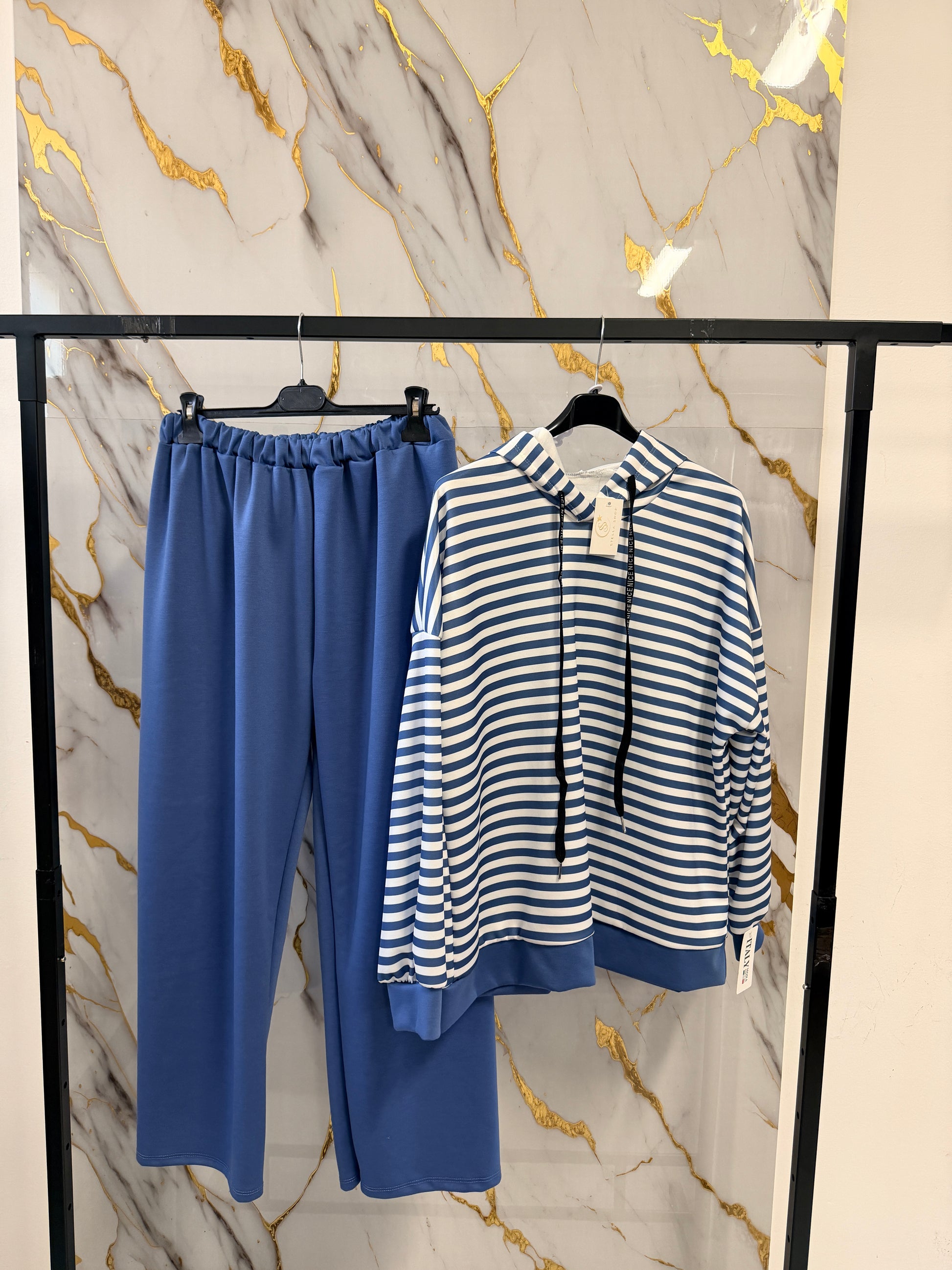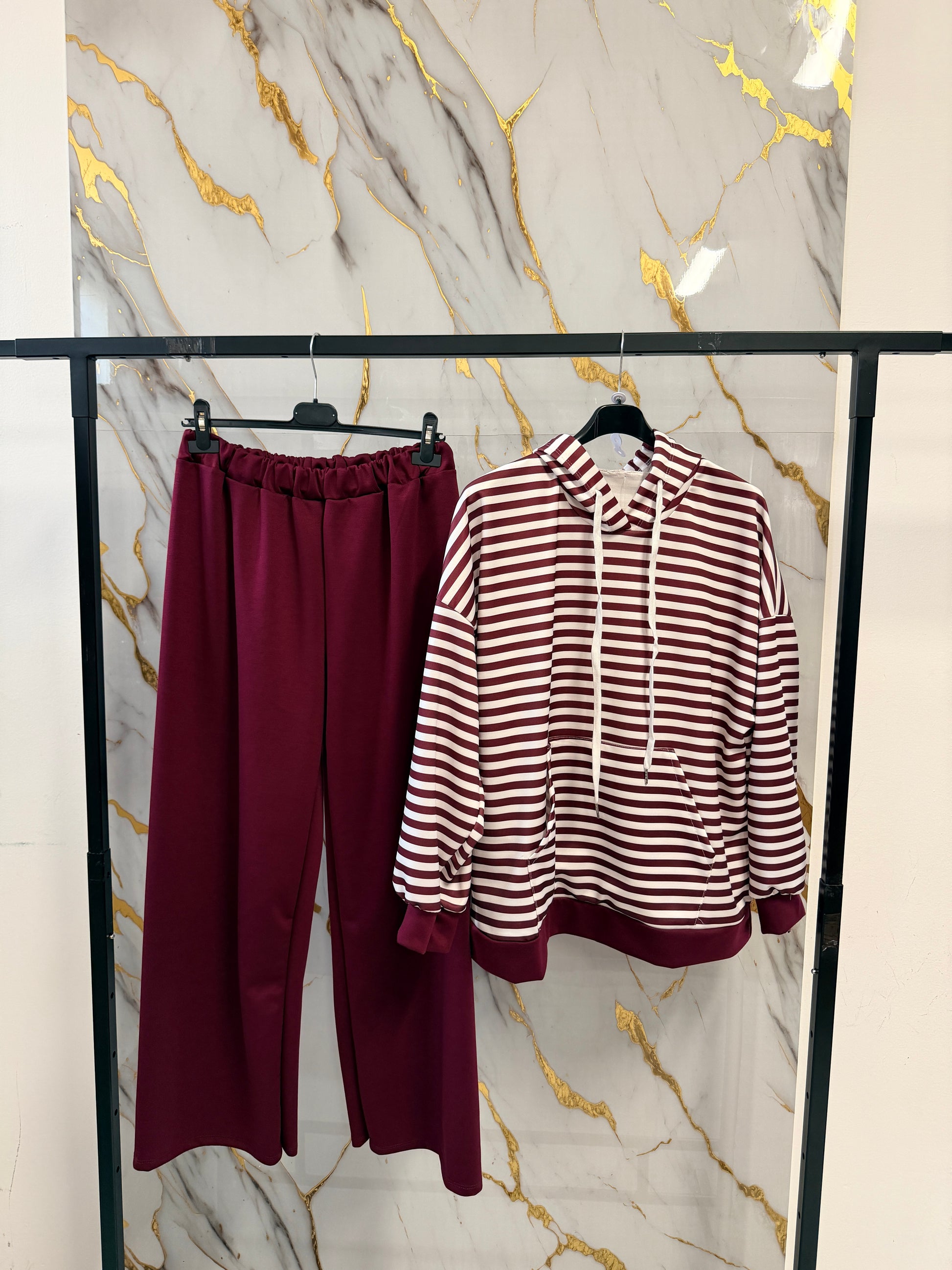 Aggiungi un tocco di stile al tuo guardaroba quotidiano con questo completo elegante e confortevole. La felpa a righe, con cappuccio e coulisse, offre un look moderno e rilassato, perfetto per ogni momento della giornata. Le maniche morbide e la vestibilità leggermente oversize garantiscono massimo comfort senza rinunciare allo stile.